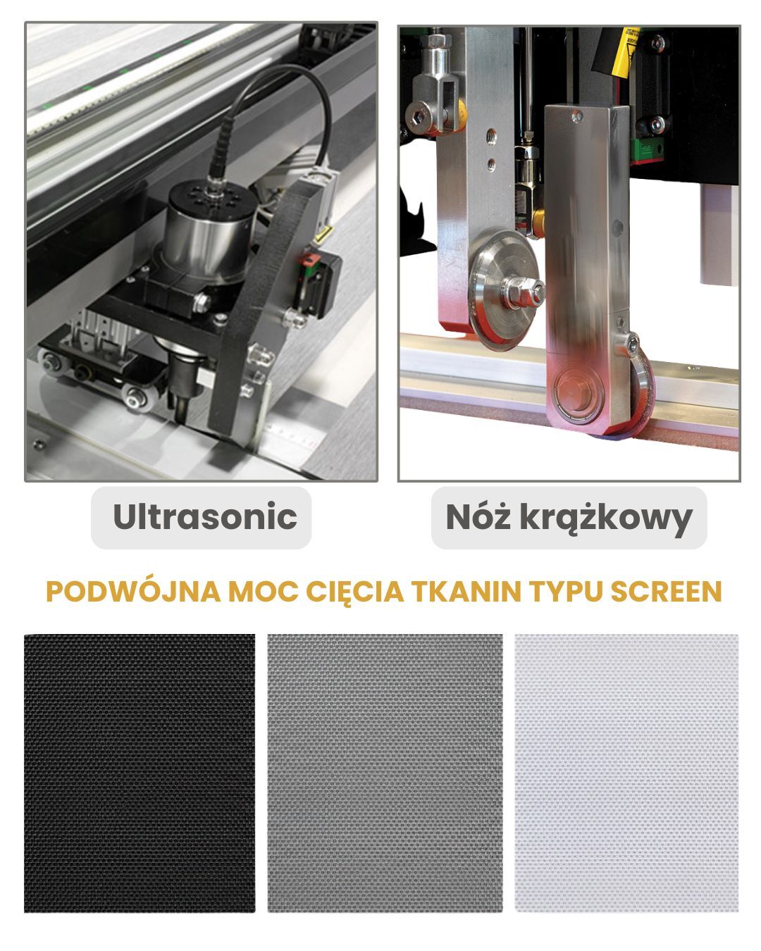 Wprowadzenie rolet typu SCREEN do asortymentu wymaga ogromnej precyzji, dlatego wybór padł na maszynę z najwyższej półki. Kluczowym atutem jest wyposażenie jej w dwa niezależne systemy tnące: nóż krążkowy oraz nóż ultrasoniczny.
